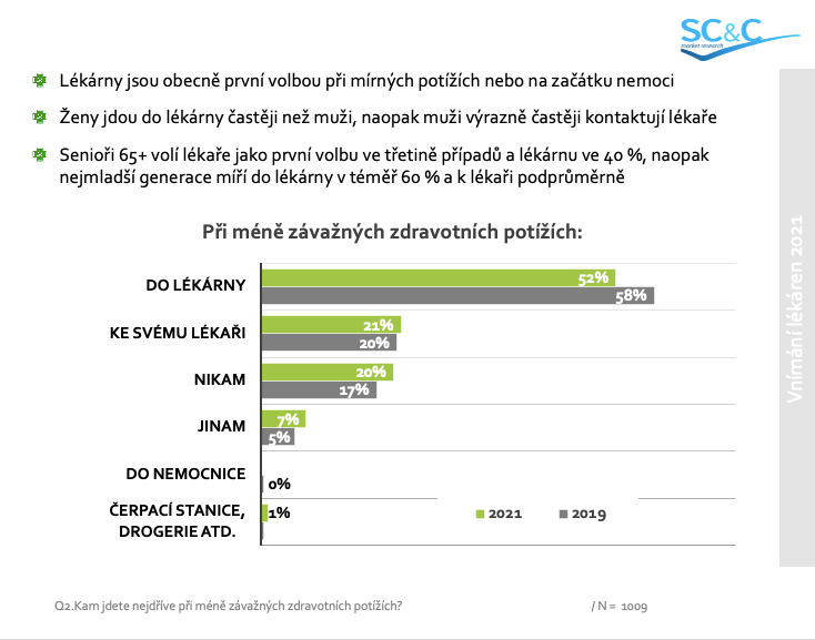 Lékárny zůstávají v očích velké většiny pacientů zdravotnickými zařízeními. I proto jsou pro více než polovinu z nich první volbou při řešení mírných potíží nebo v začátku nemoci. Ke svému lékaři v tomto případě chodí pouze 20 % pacientů nebo problém neřeší vůbec.